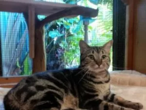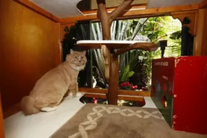 Guest can sleep in or recline on their house or relax high in the tree on a comfortable cat-sized perch, and watch the activity in their garden and pond just outside their huge floor-to-ceiling windows!